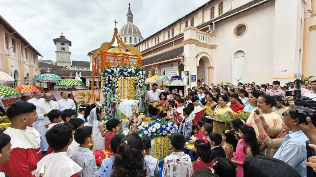 Catholics across the Diocese of Mangalore marked Monthi Fest—the Nativity of the Blessed Virgin Mary—on 8 September with vibrant parish celebrations, floral tributes by children, and the traditional blessing of the new harvest (novem). From city parishes to coastal and rural communities, the faithful gathered in large numbers for festal Masses, processions, and family meals of thanksgiving.